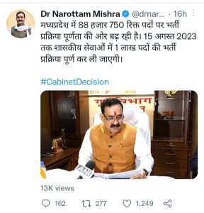 आपको बता दें कि प्रदेश के गृहमंत्री नरोत्तम मिश्रा जी के द्वारा बताया गया है कि मध्यप्रदेश में 88,750 रिक्त पदों की प्रक्रिया पूर्णता की ओर बढ़ रही है 15 अगस्त 2023 तक शासकीय सेवकों में एक लाख पदों की भर्ती प्रक्रिया पूर्ण कर ली जाएगी