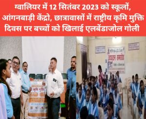 ग्वालियर में 12 सितंबर 2023 को स्कूलों, आंगनबाड़ी केंद्रो, छात्रावासों में राष्ट्रीय कृमि मुक्ति दिवस पर बच्चों को खिलाई एलबेंडाजोल गोली