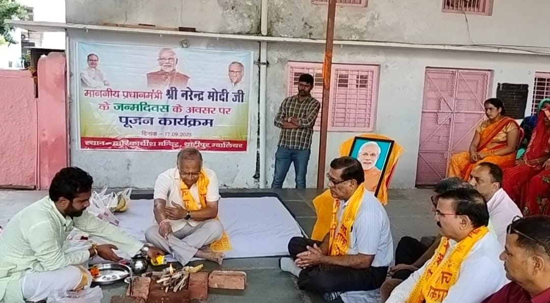 ग्वालियर-मुख्य चिकित्सा एवं स्वास्थ्य अधिकारी ग्वालियर डॉक्टर आर.के. राजोरिया ने बताया कि दिनांक 17 सितंबर 2023 (रविवार ) को देश के प्रधानमंत्री माननीय श्री नरेंद्र मोदी जी का जन्मदिन था जिसे थाटीपुर ग्वालियर में स्थित द्वारकाधीश मंदिर में आयुष्मान योजना के हितग्राहियों द्वारा ग्वालियर के सांसद माननीय श्री विवेक नारायण शेजवलकर जी की उपस्थिति में मनाया इस अवसर पर माननीय सांसद जी द्वारा हवन,पूजन आयुष्मान के हितग्राहियों की उपस्थिति में किया तथा मिठाई व प्रसाद का वितरण किया गया तथा उपस्थित माननीय सांसद श्री विवेक नारायण शेजवलकर सहित आयुष्मान भारत योजना के हितग्राहियों व स्वास्थ्य विभाग के अधिकारी/ कर्मचारियों ने माननीय देश के प्रधानमंत्री श्री नरेंद्र मोदी जी की लंबी एवं दीर्घ आयु की भगवान से प्रार्थना की तथा प्रधानमंत्री जी को सभी ने जन्म दिन की बधाई दी।