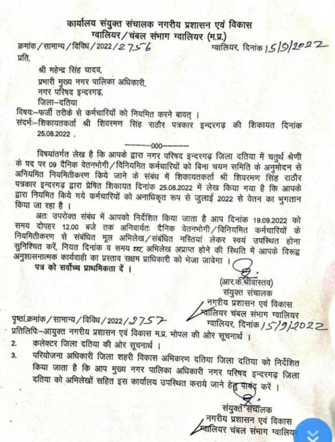 आपको बता दें कि इंदरगढ़ नगर में व्याप्त समस्याओं को लेकर हमारे दतिया ब्यूरो रहमत खान जी जब सीएमओ महोदय महेंद्र सिंह यादव की “वाइट” लेने पहुंचे तो साहब का उग्र रूप देखने को मिला, सीएमओ साहब के द्वारा पत्रकार रहमत खान जी को “वाइट”देने मना करते हुए कैमरा छीनने की कोशिश की गई एवं झूठे केस मैं फंसा देने की धमकी देते हुए सीएमओ साहब के सहयोगियों के द्वारा जान से मारने की धमकी दे दी गई वही पत्रकार रहमत खान जी के द्वारा जिला कलेक्टर महोदय से गुहार लगाई गई है कि इंदरगढ़ मैं व्याप्त समस्याओं का समाधान कराते हुए बरसों से इंदरगढ़ नगर परिषद के सीएमओ पद पर पदस्थ महेंद्र यादव के सभी कार्यों की समीक्षा कराते हुए उचित कार्रवाई करें एवं हमारे साथ कोई अनहोनी घटना घटती है तो इसकी पूरी जिम्मेदारी नगर परिषद इंदरगढ़ के सीएमओ महेंद्र सिंह यादव की होगी