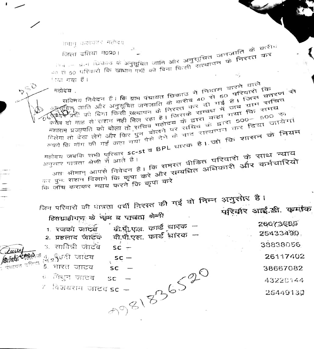 ग्रामीणों के द्वारा कलेक्टर महोदय को दिए गए आवेदन में बताया गया है कि ग्राम पंचायत छिकाउ में निवास करने वाले अनुसूचित जाति और अनुसूचित जनजाति के करीब 40 से 50 परिवारों कि खाद्यान्न पर्ची को बिना किसी सत्यापन के निरस्त कर दी गई है। जिस कारण से करीब दो माह से राशन नहीं मिल रहा है। जिसके सम्बंध में जब पंचायत सचिव मशाराम प्रजापति को बोला तो सचिव महोदय के द्वारा कहा गया कि समय मिलेगा तो देख लेगे और फिर पुन बोलने पर सचिव के द्वारा 500-500 रूपये कि माँग की गई, कहा गया पैसे देने के बाद सत्यापन कर दिया जायेगआ। ग्राम वासियों के द्वारा कलेक्टर महोदय को दिए गए आवेदन की सत्यता जानने के लिए जब हमारे द्वारा ग्राम पंचायत छिकाऊ में जाकर देखा गया तो बहुत सारी अनियमितताएं सामने आ गई। कई ग्राम वासियों ने बताया कि पंचायत सचिव मंसाराम को जो व्यक्ति सेवा शुल्क के रूप में ₹10000 दे देता है उसको योजनाओं का लाभ मिलना चालू हो जाता है चाहे वो आवास योजना ही क्यों न हो अन्यथा की स्थिति में सचिव मंसाराम, शासन की योजनाओं का लाभ नहीं मिलने देता है