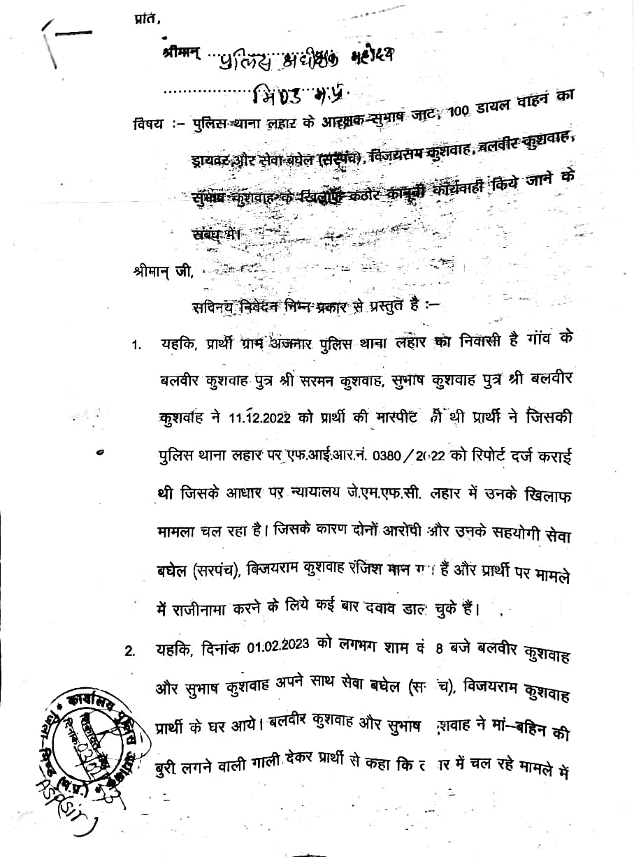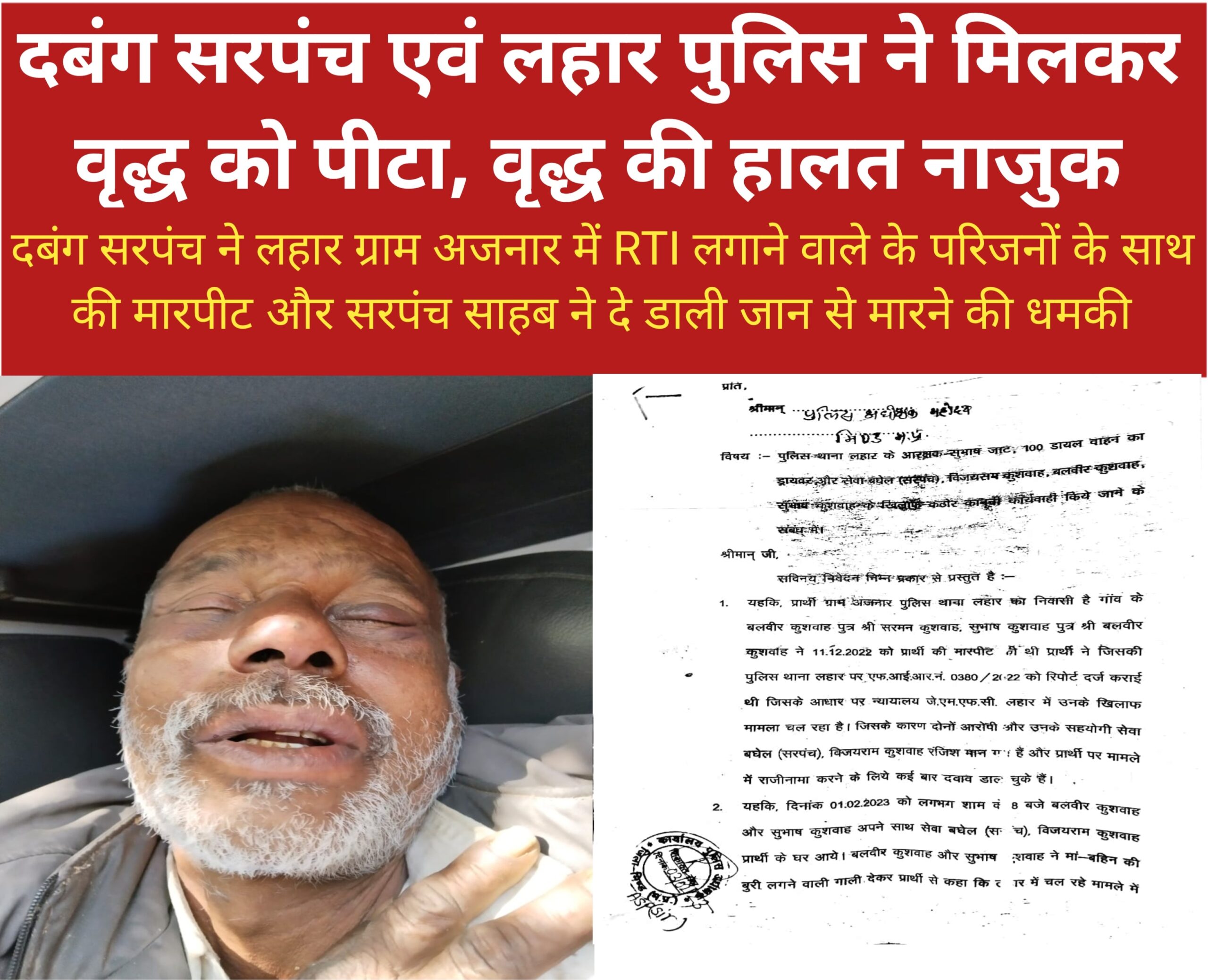 दबंग सरपंच एवं लहार पुलिस ने मिलकर वृद्ध को पीटा,वृद्ध की हालत नाजुक