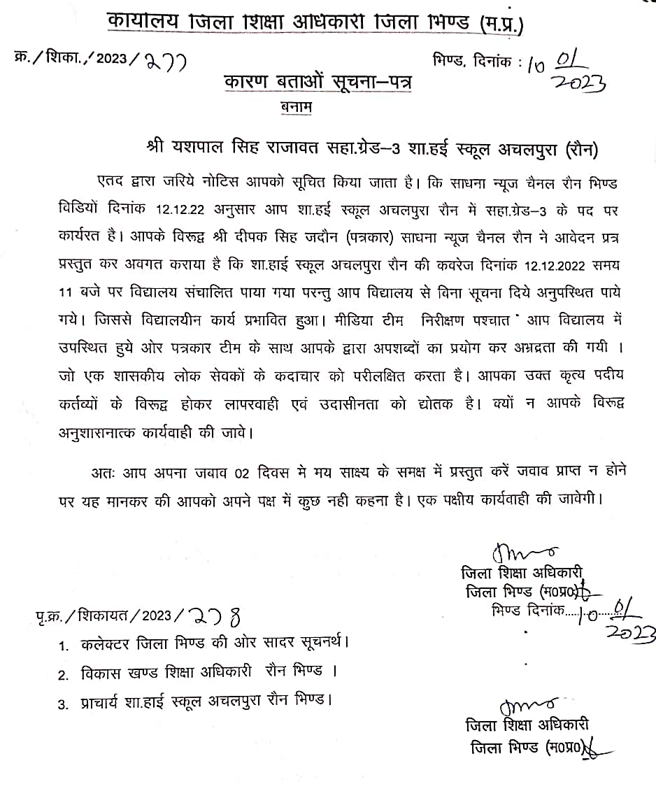 जिसकी शिकायत पत्रकार दीपक सिंह जादौन ने लिखित आवेदन के जिला शिक्षाधिकारी भिंड से की, जिस पर जिला शिक्षाधिकारी भिंड हरिभुवन सिंह तोमर ने तत्काल संज्ञान लिया और बाबू यशपाल सिंह को कारण बताओ नोटिस जारी किया जिसमे दो दिवस में जिला शिक्षाधिकारी कार्यालय में मय साक्ष्यों के समक्ष उपस्थित होकर जबाब प्रस्तुत करना होगा, उपस्थित नहीं होने पर एक पक्षीय कठोर कार्यवाही की जायेगी।