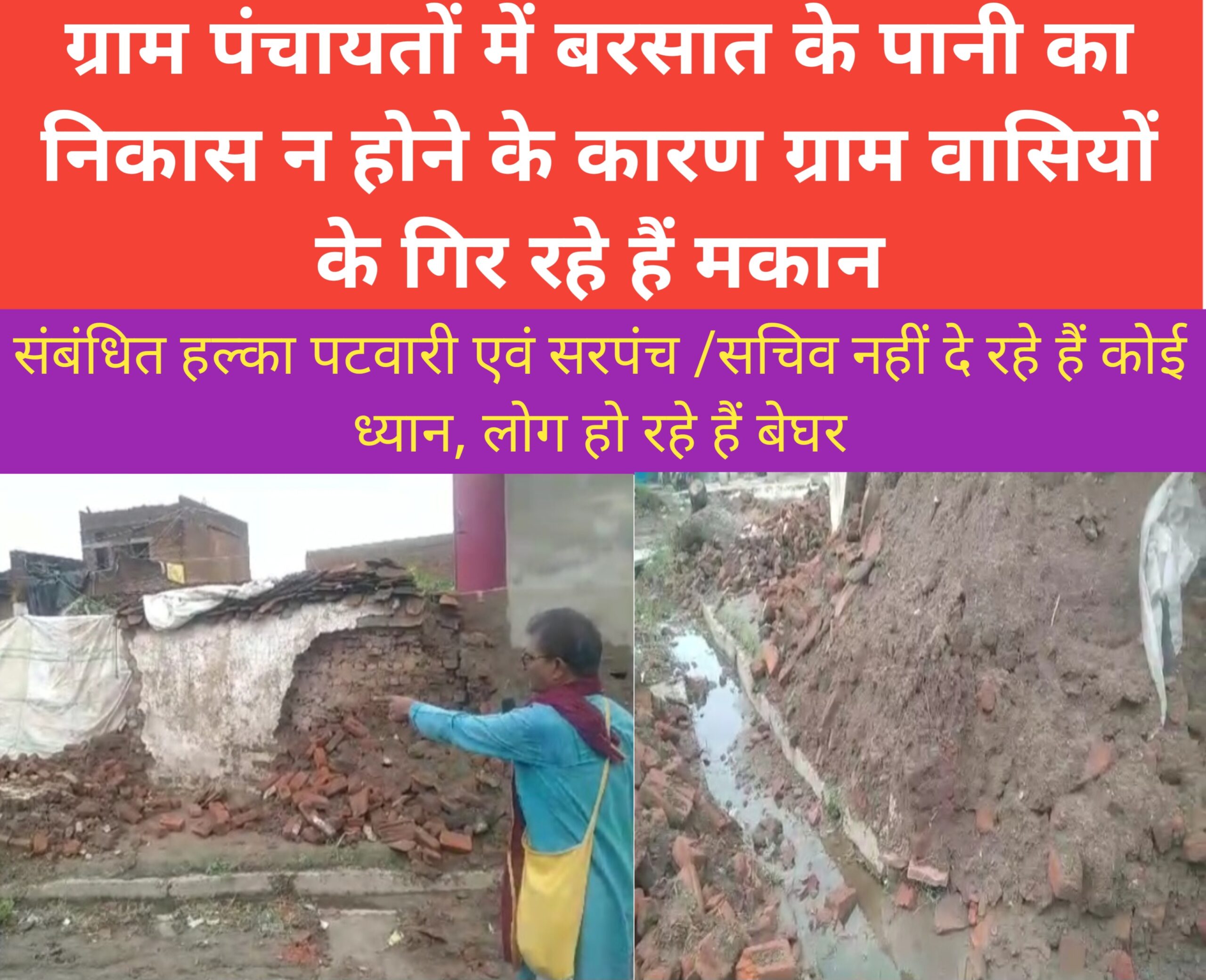 आपको बता दें कि हमारे भांडेर संवाददाता राजेंद्र श्रीवास्तव जब जनपद भांडेर के अंतर्गत आने वाली ग्राम पंचायत गोंधन में पहुंचे तो उन्होंने वहां पर देखा कि ग्राम पंचायत में बरसात के पानी की निकासी न होने के कारण कई ग्राम वासियों के मकान गिर गए हैं। जिसकी सूचना ग्राम वासियों के द्वारा कई बार सरपंच/ सचिव एवं संबंधित हल्का पटवारी को दी गई, पर उन लोगों के कान पर जूं तक नहीं रेंगी।