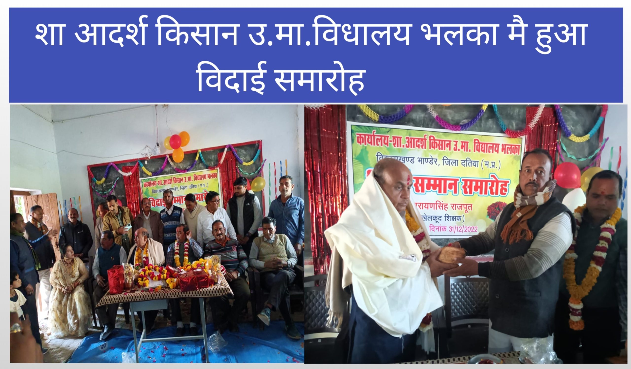 भांडेर। आज भडेर ब्लॉक के अन्तर्गत आदर्श ग्राम पंचायत भलका के शासकीय आदर्श किसान उच्चतर माध्यमिक हायर सैकेन्डिरी विधालय भलका मै शिक्षक विदाई समारोह का आयोजन किया गया। जिसमे शिक्षक पी ,टी, आई, खेल, कूद विभाग की जुम्मेदारी निवाने वाले नारायणसिंह राजपूत जी की आज विदाई समारोह बडी धूमधाम से कि गई