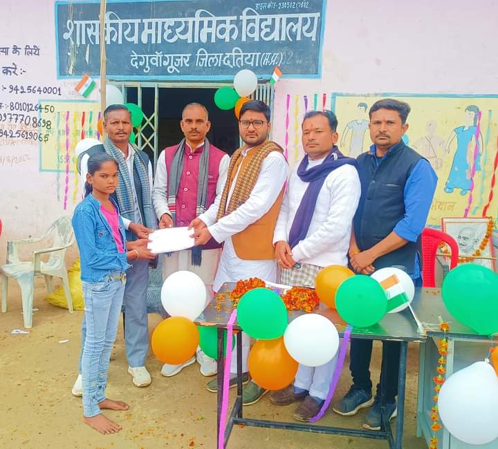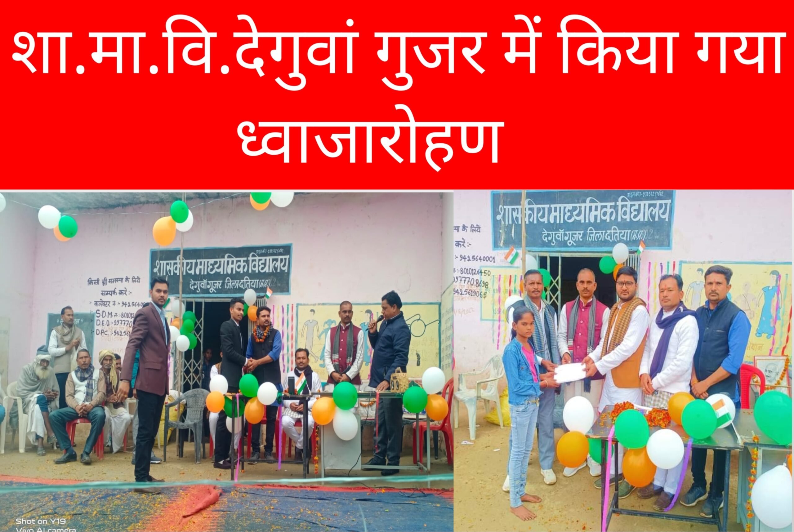 सेवड़ा। 26 जनवरी 2023 को 74 वे गणतंत्र दिवस का आयोजन शा०मा०वि० देगुवाँ गुजर में किया गया। जिसका ध्वाजारोहण अंगद सिंह सरपंच एवं जनपद पंचायत सदस्य वर्ड क्र. श्रीमती कल्पना जाटव/ मोहन सिह जाटव द्वारा किया गया कार्यक्रम की अध्यक्षता एवं मंच का संचालन श्री दोलतसिंह प्रधानाध्यापक द्वारा किया गया। कार्यक्रम में विद्यालय का समस्त स्टाफ उपस्थित रहा एव छात्र छात्राओ द्वारा अनूठी झाकियाँ एवं प्रस्तुतिया दी गई एव समूह के द्वारा विशिष्ट भोज कराया गया और ग्राम के ग्रामवासी उपस्थित रहे और कार्यक्रम का आनंद लिया और प्रसन्नता की गई। छात्र छात्राओ को जनपद सदस्य द्वारा टी-शर्ट वितरित की गई और भाषण का अभिवादन एडवोकेट शिशपाल जाटव द्वारा किया। अमन सिंह जनपद सदस्य युवा जिला अध्यक्ष विष्णु गुर्जर एवं भाषण का अभिवादन शीशपाल सिंह जाटव एडवोकेट ने किया एवं बच्चों को टीशर्ट वितरित की गई जिला पंचायत सदस्य द्वारा