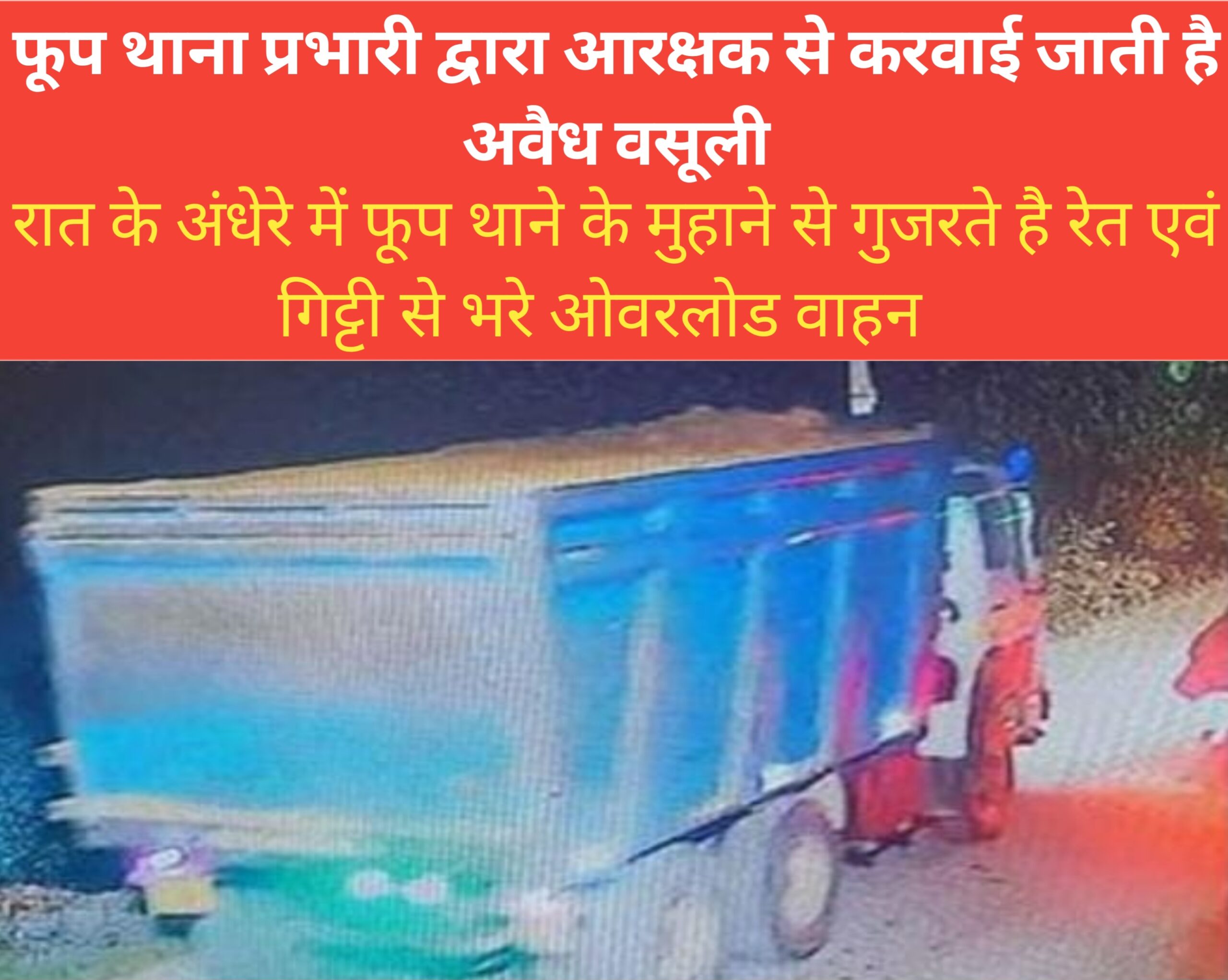 फूप थाने के ही एक आरक्षक के द्वारा और प्राइवेट गुर्गे के मदद से अवैध वसूली को अंजाम दिया जाता है। बता दें कि गिट्टी के ओवरलोड वाहन से 200 रुपये की वसूली की जाती है वही रेत के ओवरलोड डंफर से 1000 रुपए लिए जाते है।इतना ही नहीं रेत के ओवरलोड ट्रैक्टर से 500 वही तूरी (भुस) की ओवरलोड गाड़ी से 400 की वसूली की जाती है।