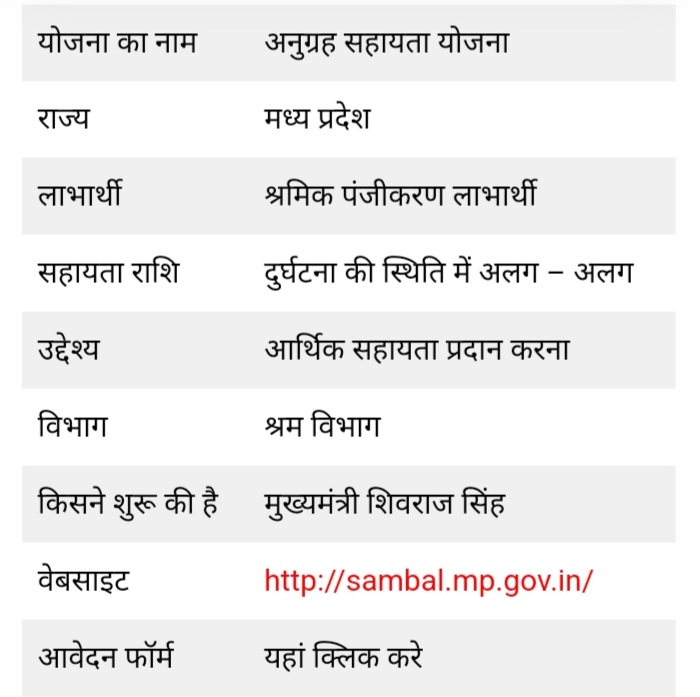 मध्यप्रदेश की शिवराज सरकार सरकार के द्वारा मजदूर श्रमिक वर्ग के लोगो आर्थिक सहायता पहुंचाने के उद्देश्य “संबल योजना” का शुभारंभ 2018 में किया गया था। क्योंकि मध्यप्रदेश में अधिकतर लोग श्रमिक एवं मजदूर है जिनकी आर्थिक स्थितियां ठीक नहीं है। ऐसे कई परिवार निवासरत है जिसमें कमाने वाला व्यक्ति एक होता है, लेकिन उस श्रमिक मजदूर के साथ में माता- पिता, पत्नी, बच्चे आदि भी श्रमिक की मजदूरी पर आश्रित होते हैं। ऐसी स्थिति में यदि मजदूर के साथ कोई दुर्घटना हो जाती है और उसकी दुर्घटना में मृत्यु हो जाती है तो शासन के द्वारा परिवार को आर्थिक सहायता देने के उद्देश्य से “अनुग्रह सहायता योजना” लागू की गई।
