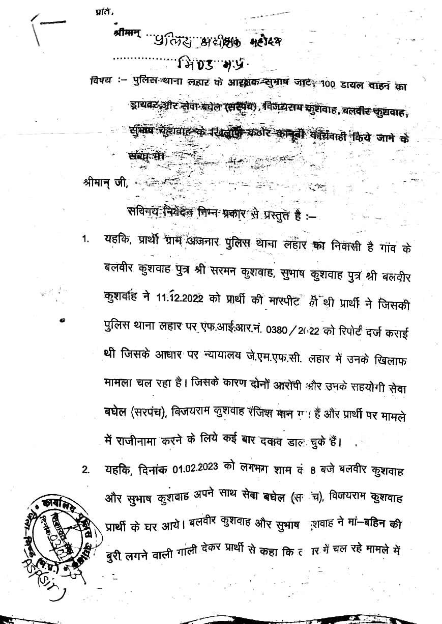 आपको बता दें कि लहार अनुभाग के अंतर्गत आने वाले ग्राम अजनार के निवासी करन सिंह पर ग्राम पंचायत के सरपंच सेवा एवं हंड्रेड डायल का ड्राइवर सहित आरक्षक सुभाष जाट के द्वारा दिनांक 1 फरवरी 2023 को बेरहमी से मारपीट की गई थी जिसके चलते फरियादी की हालत को देखते हुए भिंड जिला अस्पताल में 5 दिन भर्ती रहकर इलाज चला, उसके बाद फरियादी के द्वारा भिंड एसपी एवं लहार एसडीएम को आवेदन देकर न्याय के लिए गुहार लगाई लेकिन आज दिनांक तक लहार पुलिस के द्वारा आरोपियों पर कार्रवाई न करते हुए केवल खानापूर्ति की जा रही है। वही फरियादी करन सिंह के द्वारा मीडिया के माध्यम से वरिष्ठ अधिकारियों से न्याय के लिए गुहार लगाई। अब आगे देखना यह है कि लहार पुलिस के द्वारा मामले में उचित कार्रवाई की जाती है या फिर आरोपियों को बचाया जाता है