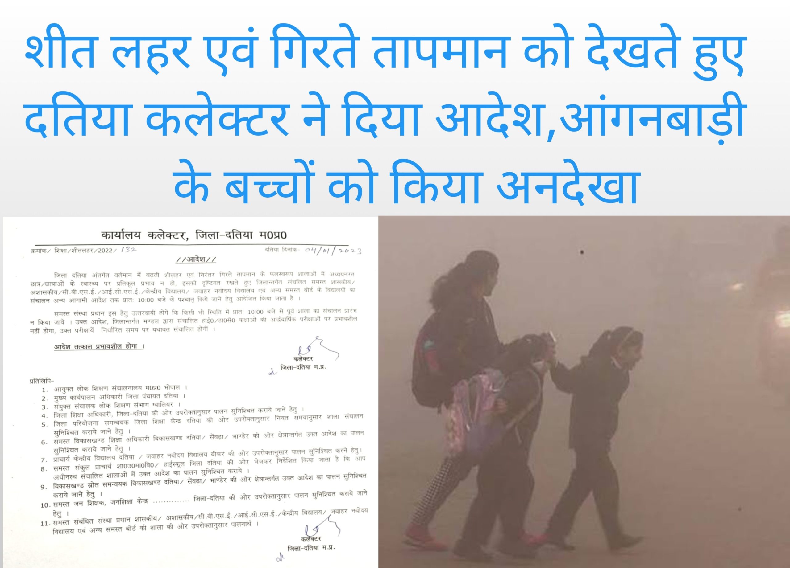 शीतलहर एवं गिरते तापमान को देखते हुए दतिया कलेक्टर ने दिया आदेश,आंगनबाड़ी के बच्चों को किया अनदेखा