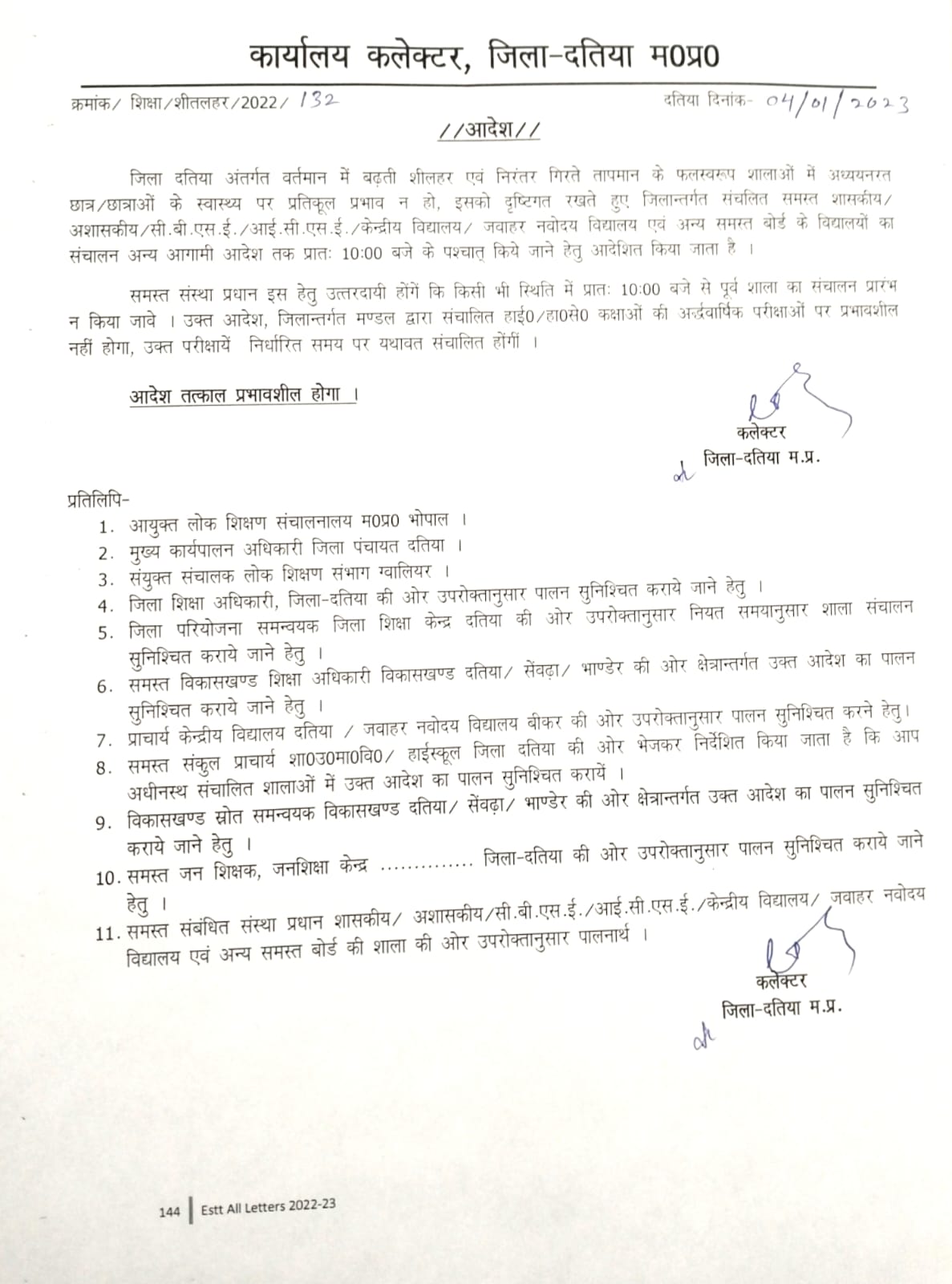 जिला दतिया अंतर्गत वर्तमान में बढ़ती शीलहर एवं निरंतर गिरते तापमान के फलस्वरूप शालाओं में अध्ययनरत छात्र/छात्राओं के स्वास्थ्य पर प्रतिकूल प्रभाव न हो, इसको दृष्टिगत रखते हुए जिलान्तर्गत संचलित समस्त शासकीय/अशासकीय/ सी.बी.एस.ई./आई.सी.एस.ई. / केन्द्रीय विद्यालय / जवाहर नवोदय विद्यालय एवं अन्य समस्त बोर्ड के विद्यालयों का है संचालन अन्य आगामी आदेश तक प्रातः 10:00 बजे के पश्चात् किये जाने हेतु आदेशित किया जाता।समस्त संस्था प्रधान इस हेतु उत्तरदायी होंगें कि किसी भी स्थिति में प्रातः 10:00 बजे से पूर्व शाला का संचालन प्रारंभ न किया जावे । उक्त आदेश, जिलान्तर्गत मण्डल द्वारा संचालित हाई० / हा0से0 कक्षाओं की अर्द्धवार्षिक परीक्षाओं पर प्रभावशील नहीं होगा, उक्त परीक्षायें निर्धारित समय पर यथावत संचालित होंगीं