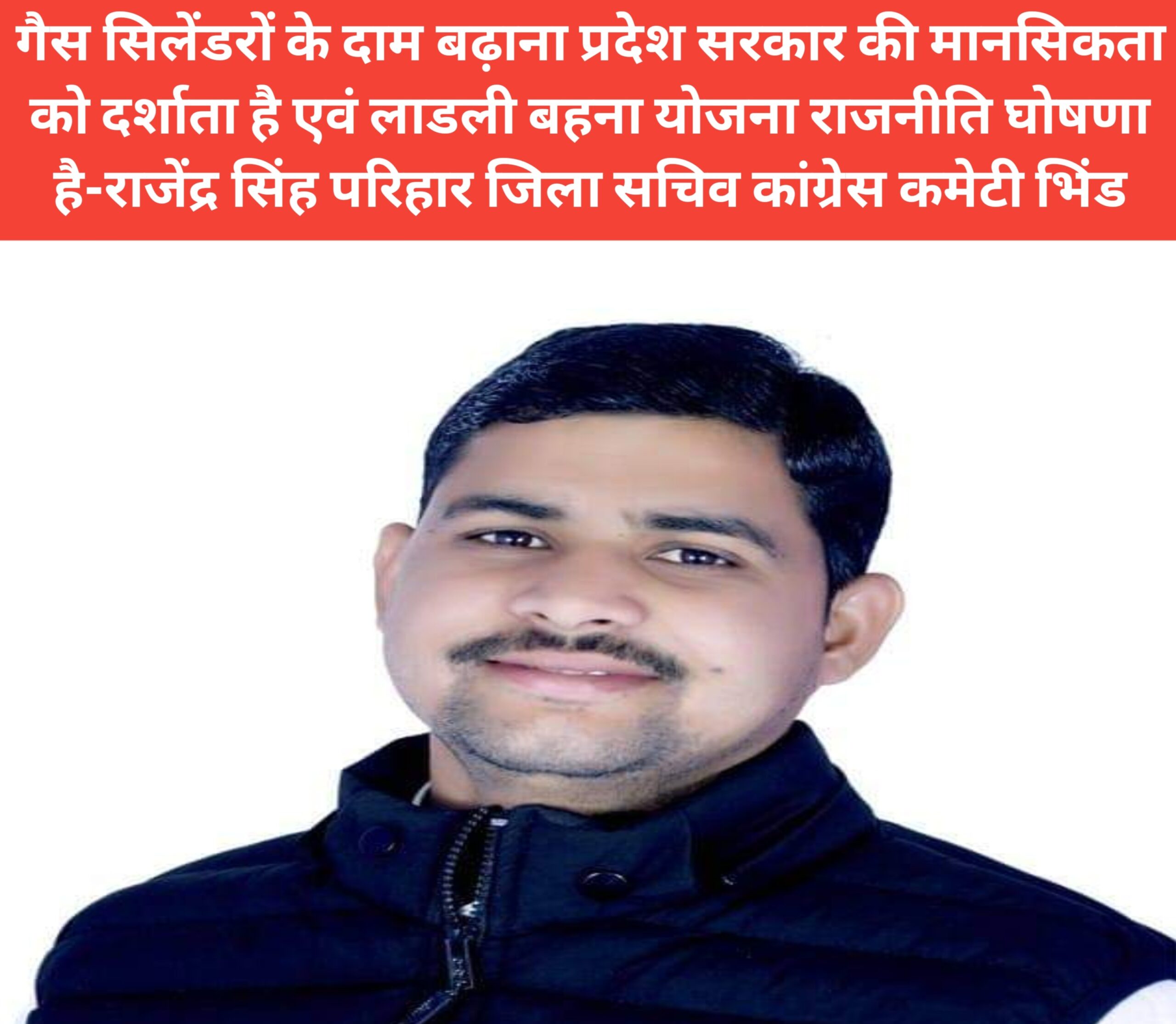 गैस सिलेंडरों के दाम बढ़ाना प्रदेश सरकार की मानसिकता को दर्शाता है एवं लाडली बहना योजना राजनीति घोषणा है-राजेंद्र सिंह परिहार जिला सचिव कांग्रेस कमेटी भिंड