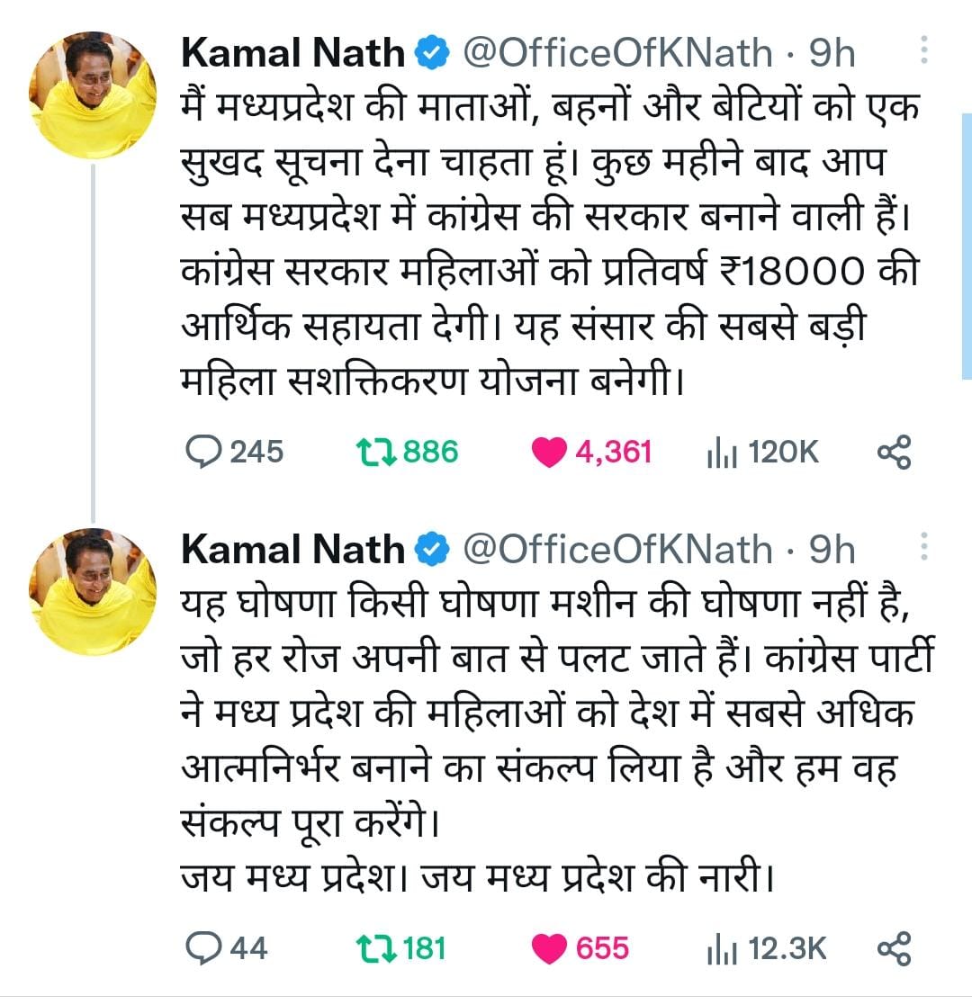 वही भिंड से कांग्रेसी नेता राजेंद्र सिंह परिहार ने कहा है कि यदि प्रदेश में कांग्रेस की कमलनाथ सरकार बनती है तो प्रदेश की हर बहनों को सरकार आर्थिक सहायता के रूप में 1500 प्रति माह देगी इतना ही नहीं कांग्रेस की सरकार बनी तो घरेलू गैस सिलेंडर की कीमत भी ₹500 होगी जोहार आम आदमी के बजट से बाहर नहीं होगी कमलनाथ ने 5 मार्च को एक आधिकारिक दावा करते हुए कहा की कांग्रेस सरकार महिलाओं को प्रति वर्ष 18,000 रुपये की आर्थिक सहायता देगी। यह दुनिया की सबसे बड़ी महिला सशक्तिकरण योजना बन जाएगी।