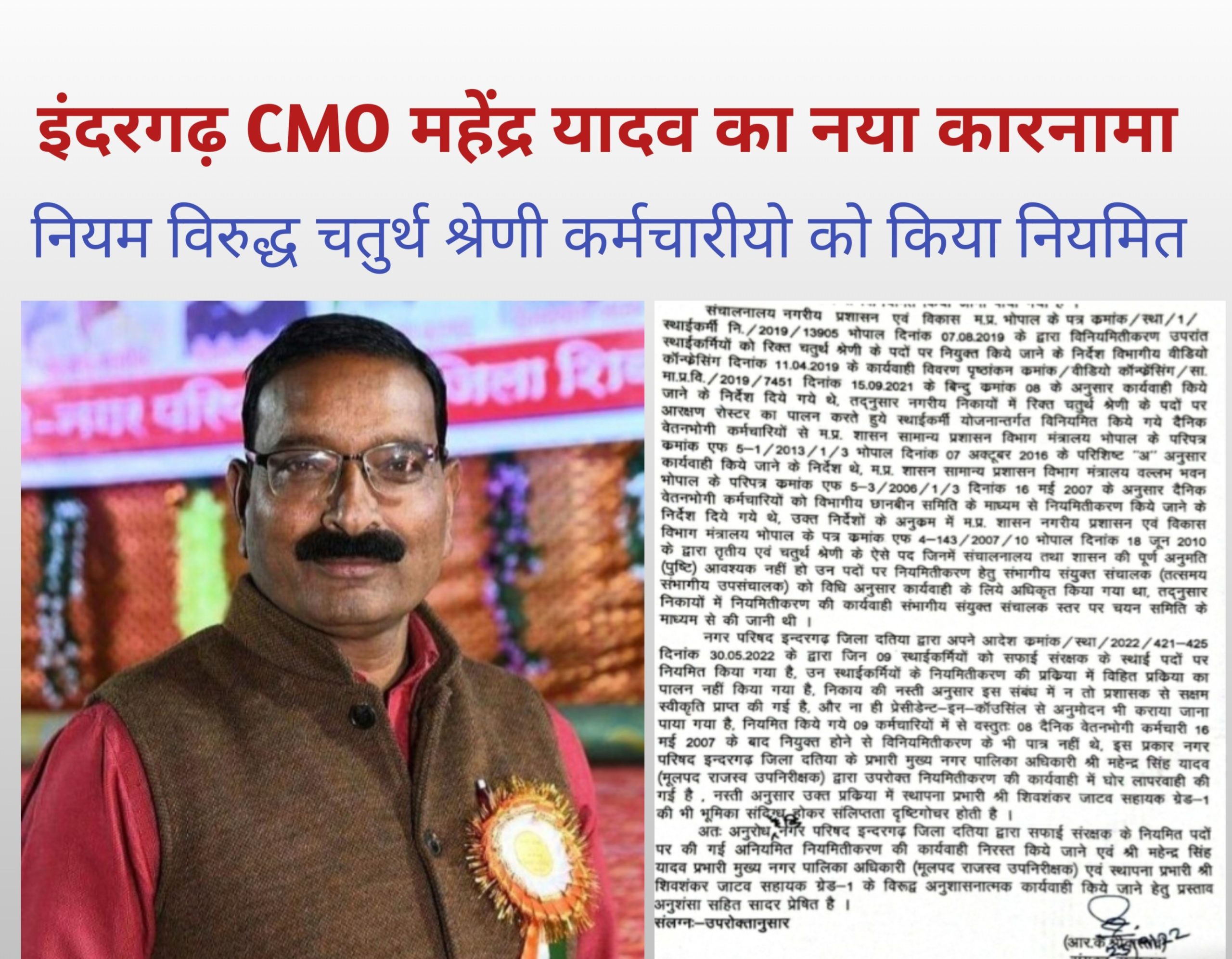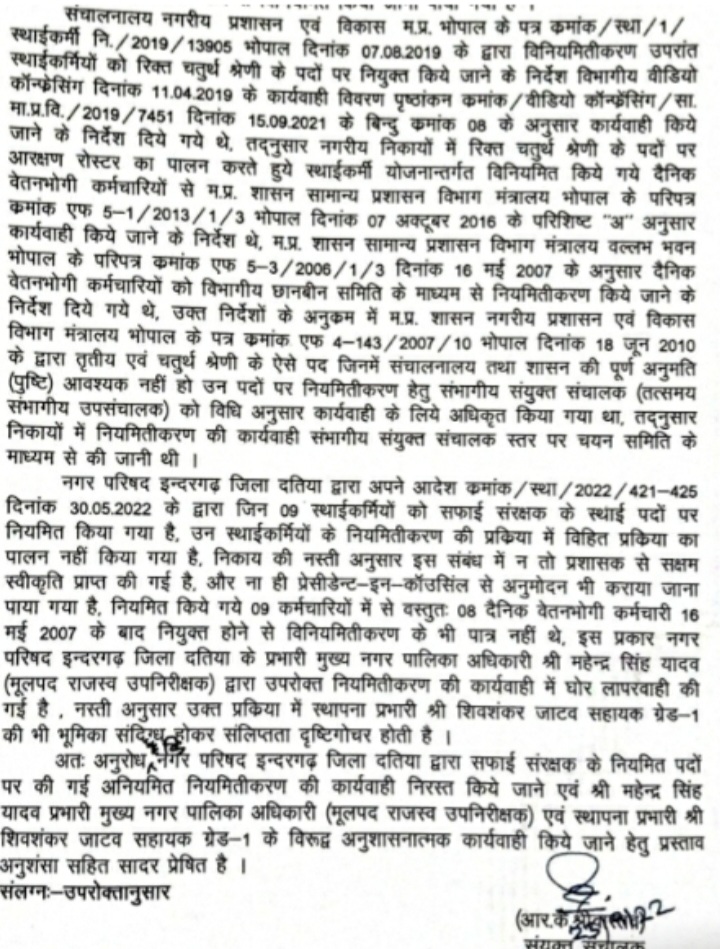 आपको बता दें कि संयुक्त संचालक आरके श्रीवास्तव जी के पत्र में स्पष्ट उल्लेख किया गया है कि नगर परिषद इन्दरगढ़ जिला दतिया द्वारा अपने आदेश क्रमांक / स्था/2022/421-425 दिनांक 30.05.2022 के द्वारा जिन 09 स्थाईकर्मियों को सफाई संरक्षक के स्थाई पदों पर नियमित किया गया है, उन स्थाईकर्मियों के नियमितीकरण की प्रक्रिया में विहित प्रक्रिया का पालन नहीं किया गया है। निकाय की नस्ती अनुसार इस संबंध में न तो प्रशासक से सक्षम स्वीकृति प्राप्त की गई है और ना ही प्रेसीडेन्ट-इन-कॉउसिंल से अनुमोदन भी कराया जाना पाया गया है। नियमित किये गये 09 कर्मचारियों में से वस्तुतः 08 दैनिक वेतनभोगी कर्मचारी 16 मई 2007 के बाद नियुक्त होने से विनियमितीकरण के भी पात्र नहीं थे, इस प्रकार नगर परिषद इन्दरगढ़ जिला दतिया के प्रभारी मुख्य नगर पालिका अधिकारी श्री महेन्द्र सिंह यादव (मूलपद राजस्व उपनिरीक्षक) द्वारा उपरोक्त नियमितीकरण की कार्यवाही में घोर लापरवाही की गई है, नस्ती अनुसार उक्त प्रक्रिया में स्थापना प्रभारी श्री शिवशंकर जाटव सहायक ग्रेड-1 की भी भूमिका संदिग्ध होकर संलिप्तता दृष्टिगोचर होती है