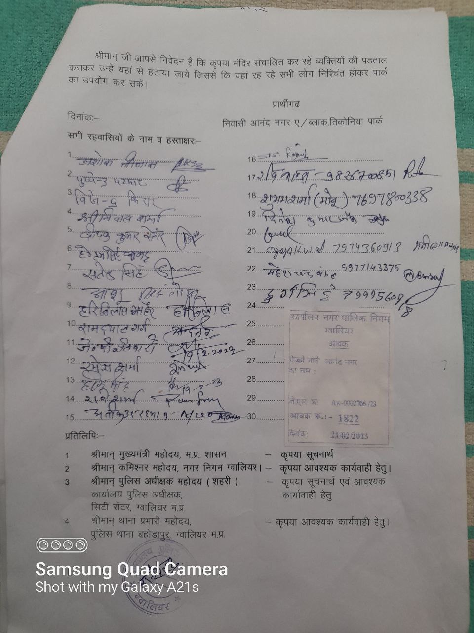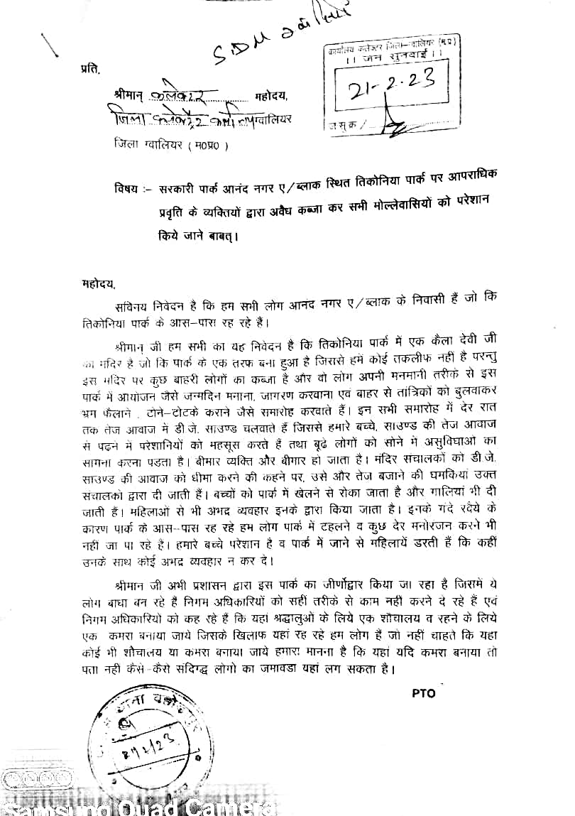 आपको बता दें कि ग्वालियर नगर निगम की वार्ड क्रमांक 5 आनंद नगर ए ब्लॉक कि तिकोनिया पार्क पर भू माफिया तुलसी नामक व्यक्ति ने वर्षों से कब्जा कर रखा है। पार्क में यदि कॉलोनी के स्थानीय निवासी घूमने आते हैं तो उनके साथ दबंग भूमाफिया दुर्व्यवहार करता रहता है जिससे परेशान होकर स्थानीय निवासियों के द्वारा ग्वालियर कलेक्टर एवं एसपी महोदय के यहां गुहार लगाई कि तुलसी नामक दबंग भूमाफिया से पाक को मुक्त कराएं जिससे कि कॉलोनी के स्थानीय निवासी पार्क में घूम सकें