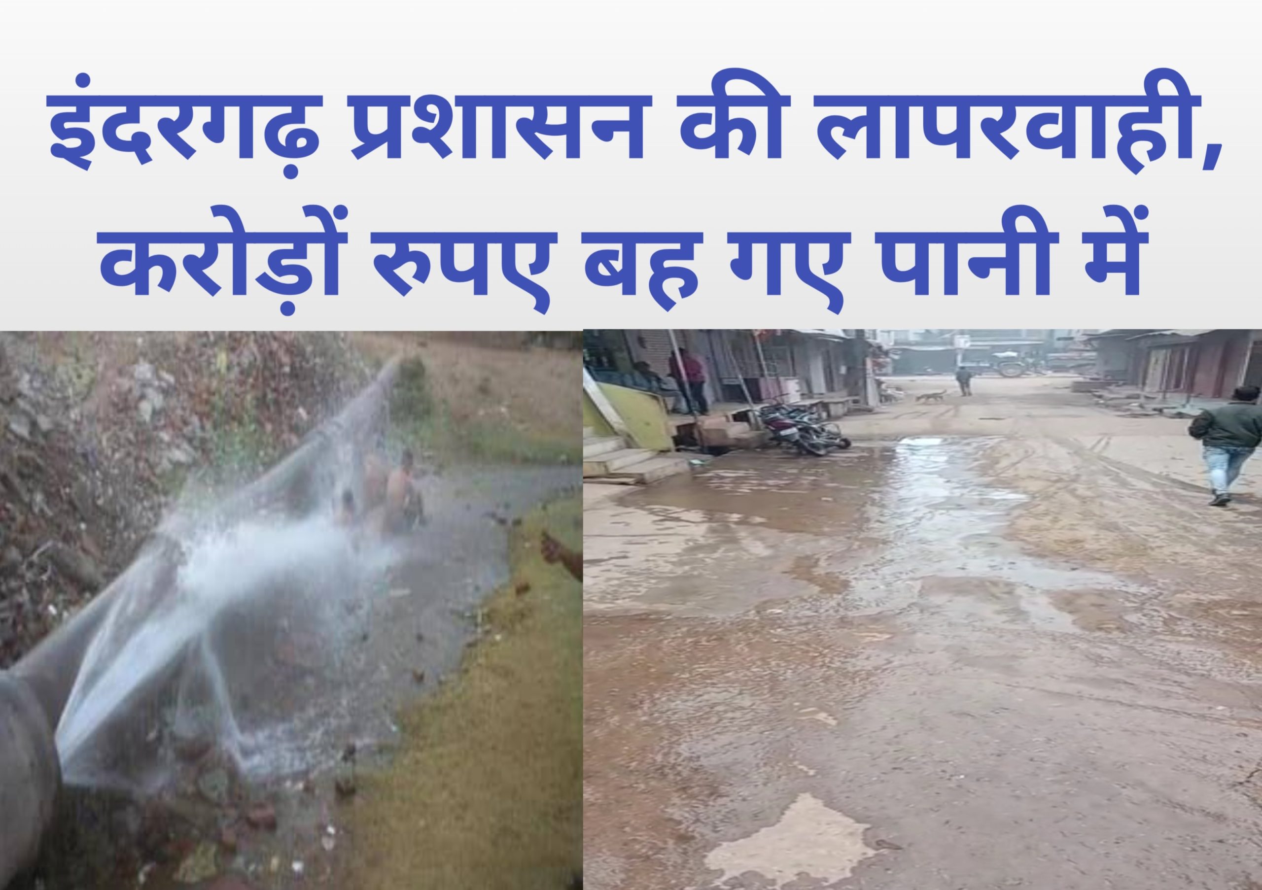 आपको बता दें कि कुछ ही दिनों पहले नगर में व्याप्त पानी की समस्या को लेकर करोड़ों रुपए की लागत से पानी की लाइन बिछाई गई थी लेकिन नगर प्रशासन के जिम्मेदार अधिकारियों की लापरवाही के कारण आज करोड़ों रुपए लगाकर से बिछाई गई पानी की लाइन जगह-जगह लीकेज हो रही है। जिससे लाखों लीटर पानी का नुकसान प्रतिदिन होता रहता है जिसकी नगर प्रशासन का ध्यान ही नहीं है इंदरगढ़ प्रशासन के द्वारा वाह वाही लूटने के लिए योजनाओं को केवल दिखावे के लिए ही किया जा रहा है