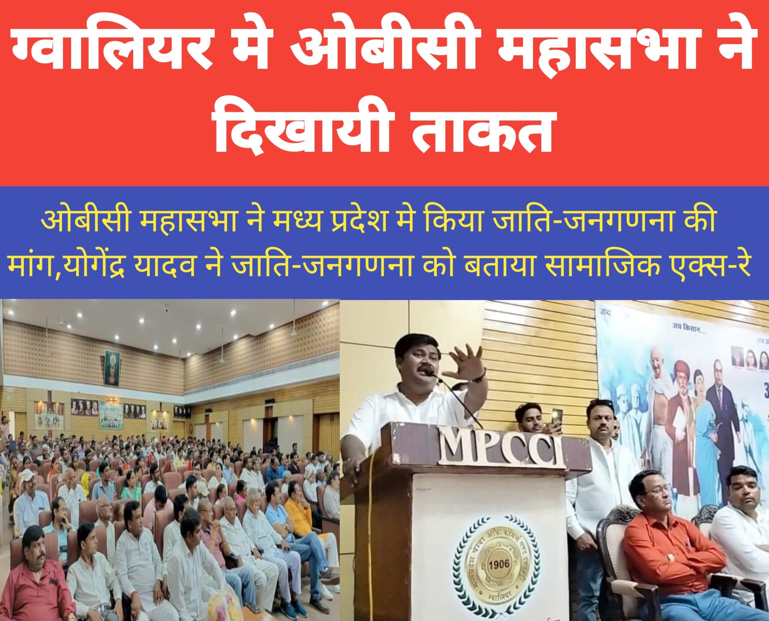 ओबीसी महासभा के राष्ट्रीय प्रवक्ता विश्वजीत रतोनिया ने बताया कि ग्वालियर के चंबर्स ऑफ़ कॉमर्स सभागार मे ओबीसी महासभा द्वारा विशाल सामाजिक न्याय-सम्मेलन आयोजित किया जिसमे मध्य-प्रदेश मे एक स्वर मे जाति-जनगणना की मांग हुयी जिसका समर्थन सभागार मे उपस्थित सभी वर्गों के लोगो ने समर्थन किया, साथ ही आबादी के आधार हिस्सेदारी सुनिश्चित करने का प्रस्ताव पारित हुआ.