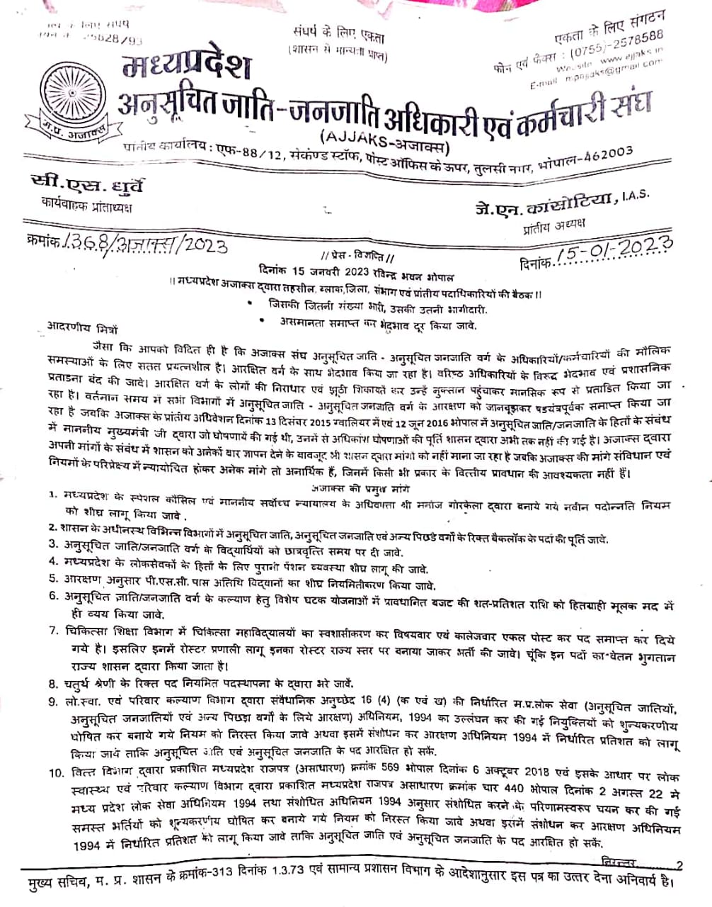 इसके बाद अजाक्स संघ की 24 सूत्रीय मांगों पर श्री राम सेवक भारती, हरिनारायण जाटव जूलिया, सिक्का छक्की लाल अहिरवार, कुंवर सिंह कंडोलिया, प्रहलाद माहोर, मथुरा प्रसाद अहिरवार, मुकेश पटवा, गंधर्व सिंह वाल्मीकि, जयराम पटवा, परमानंद पांडे, राजकुमार सोनी आदि ने अपने अपने विचार रखें कार्यक्रम के मुख्य अतिथि श्री राजोरिया ने सुप्रीम कोर्ट के एडवोकेट मनोज गोरकेला द्वारा बनाया गया ड्राफ्ट प्रमोशन में आरक्षण लागू किया जाए। जिलाध्यक्ष श्री शिवचरण जाटव ने बैकलॉग पद शीघ्र भरने की सरकार से मांग की कार्यक्रम में डॉक्टर वीर सिंह खरे, विद्याराम जाटव, भगवान सिंह अहिरवार, श्रीराम जाटव, कमल सिंह जाटव, अरविंद बंशकार, राजेश कतरोलिया, विनोद बंशकार, हरदयाल सरपंच, विजय कुमार पटवारी, संतोष कुमार अहिरवार, यशपाल गौतम, फूल सिंह अहिरवार, रामनिवास जाटव, राम सिंह जाटव, सचिन अहिरवार, रामनारायण जाटव, पर्वत सिंह यादव, रामलाल गौतम, सरनाम सिंह जाटव, राधे लाल अहिरवार, हरचरण अहिरवार, प्रताप सिंह अहिरवार, रामकिशन अहिरवार, अरविंद बौद्ध, केशव वर्मा, जगदीश प्रसाद अहिरवार, महेश कुमार अहिरवार आदि सम्मिलित हुए कार्यक्रम का संचालन बद्री प्रसाद अहिरवार ने किया तथा आभार व्यक्त छोटेलाल गौतम के द्वारा किया गया