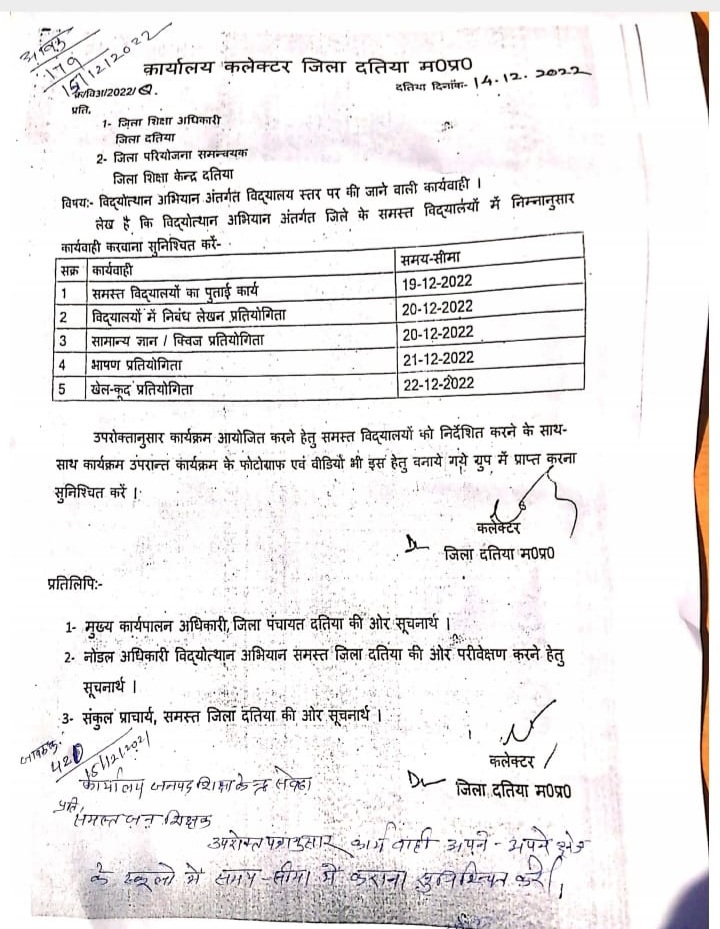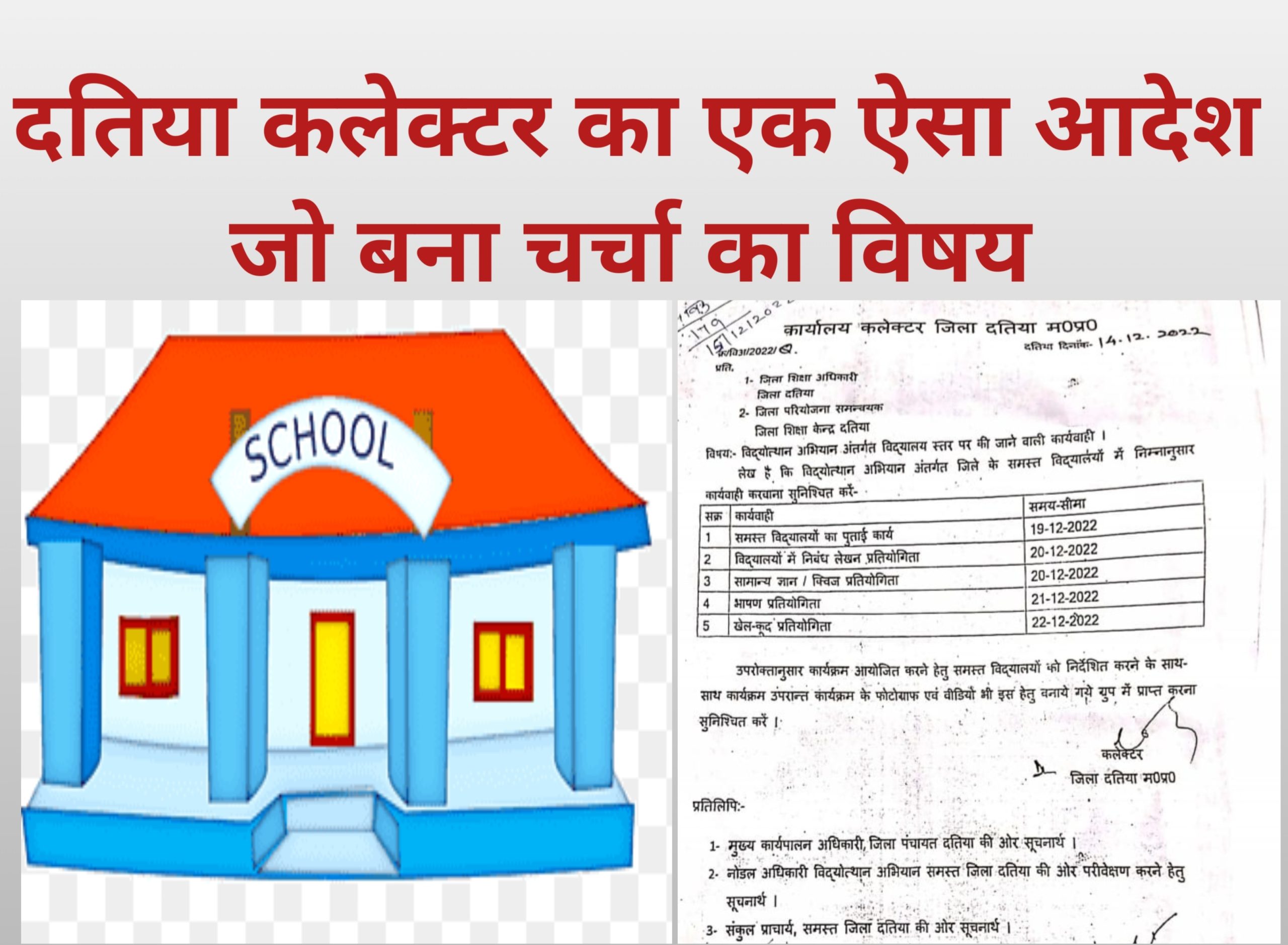 आपको बता दें कि दतिया जिले के कलेक्टर महोदय के द्वारा विद्या उत्थान योजना को लेकर एक आदेश जारी किया गया था। आदेश मे जिले के सभी स्कूलों में निम्न कार्य होना सुनिश्चित किया गया है। जैसे समस्त विद्यालयों का पुताई कार्य, विद्यालयों में निबंध लेखन प्रतियोगिता, सामान्य ज्ञान प्रतियोगिता, भाषण प्रतियोगिता, खेलकूद प्रतियोगिता आदि। आदेश को 14/ 12/ 2022 को जारी किया गया था जिसमें सभी कार्यों को पूर्ण करने की समय सीमा तय करते हुए 19 से 22 दिसंबर निर्धारित की गई थी। समय सीमा समाप्त हो जाने पर हमारे द्वारा जिले के कुछ स्कूलों में जाकर देखा गया तो आदेश की वास्तविकता सामने आ गई। क्योंकि दतिया जिले के अधिकतर स्कूल प्रभारियों का कहना है कि हमारे खाते में फंड नहीं है तो हम कार्यों को कैसे कराएं, कब तक हम अपनी निजी राशि से स्कूल की पुताई एवं फर्नीचर के कार्य कराते रहें