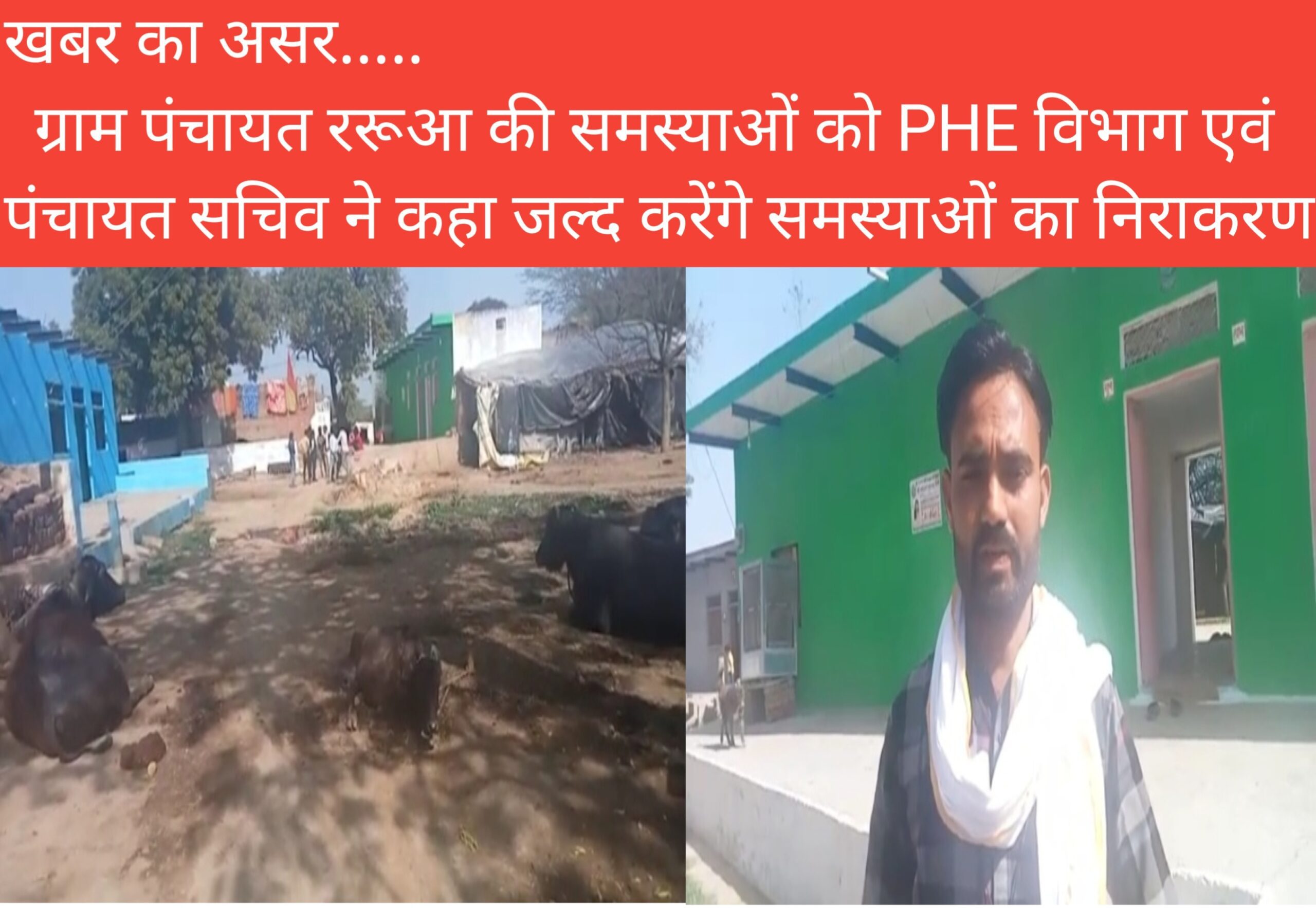 आपको बता दें कि कुछ समय पूर्व चम्बल आचरण के द्वारा ग्राम पंचायत ररूआ की समस्याओं को प्रकाशित किया गया था लेकिन शासन प्रशासन की कान पर जूं तक नहीं रेंगी, लेकिन जब चम्बल आचरण की टीम पुनः दिनांक 11 फरवरी को ररूआ ग्राम पंचायत में पहुंची जिसका पता ग्राम पंचायत सचिव सहित पीएचई विभाग के कर्मचारियों को लगी तो वह सभी तुरंत ग्राम पंचायत में पहुंच गए और समस्त ग्राम वासियों को विश्वास दिलाते हुए कहा कि हम लोग जल्द से जल्द ग्राम पंचायत में व्याप्त पानी की समस्या का समाधान करेंगे