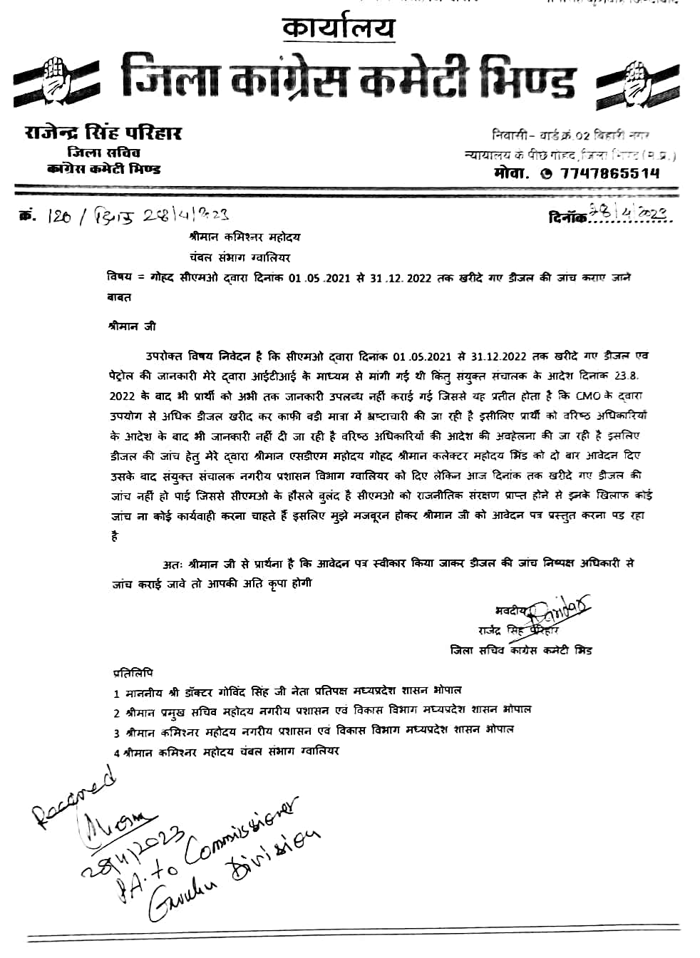 भिंड। गोहद सीएमओ के द्वारा खरीदे गए डीजल की जांच हेतु राजेंद्र सिंह परिहार जिला सचिव कांग्रेस कमेटी भिंड ने चंबल संभाग के कमिश्नर से मिलकर बताया है कि सीएमओ द्वारा डीजल खरीदी में काफी अनियमितताएं की गई है जिसकी शिकायत मेरे द्वारा कई बार की जा चुकी है कलेक्टर महोदय से शिकायत की लेकिन कलेक्टर महोदय सीएमओ साहब पर मेहरबान है हमारे द्वारा कलेक्टर महोदय को दिए गए शिकायती आवेदन पर कोई कार्यवाही नहीं करना चाहते हैं दिनांक 01 .05.2021 से 31.12.2022 तक खरीदे गए डीजल एवं पेट्रोल की जानकारी मेरे द्वारा आईटीआई के माध्यम से मांगी गई थी किंतु संयुक्त संचालक के आदेश दिनांक 23.8. 2022 के बाद भी प्रार्थी को अभी तक जानकारी उपलब्ध नहीं कराई गई जिससे यह प्रतीत होता है कि CMO के द्वारा उपयोग से अधिक डीजल खरीद कर काफी बड़ी मात्रा में भ्रष्टाचारी की जा रही है इसीलिए प्रार्थी को वरिष्ठ अधिकारियों के आदेश के बाद भी जानकारी नहीं दी जा रही है वरिष्ठ अधिकारियों के आदेश की अवहेलना की जा रही है