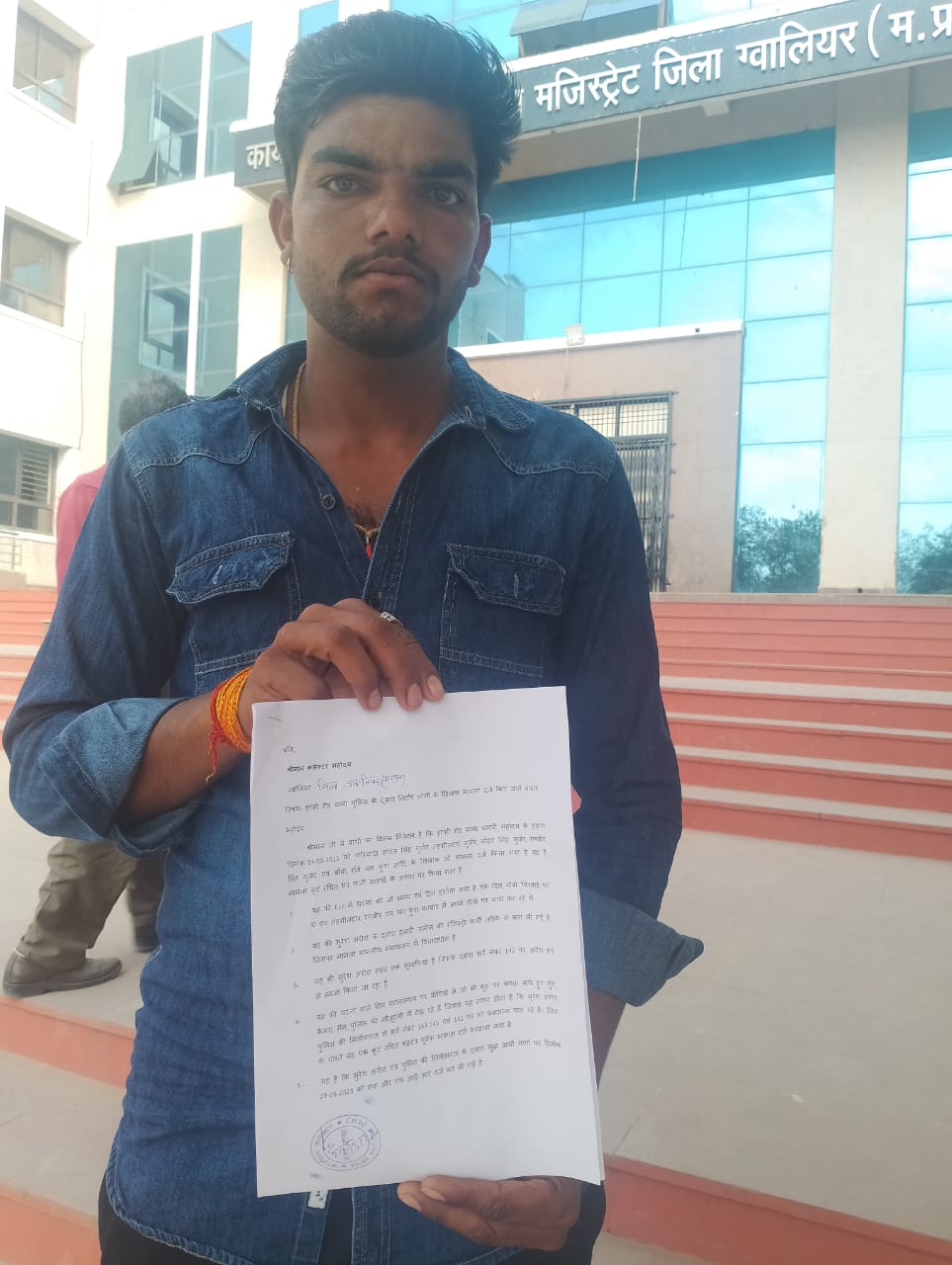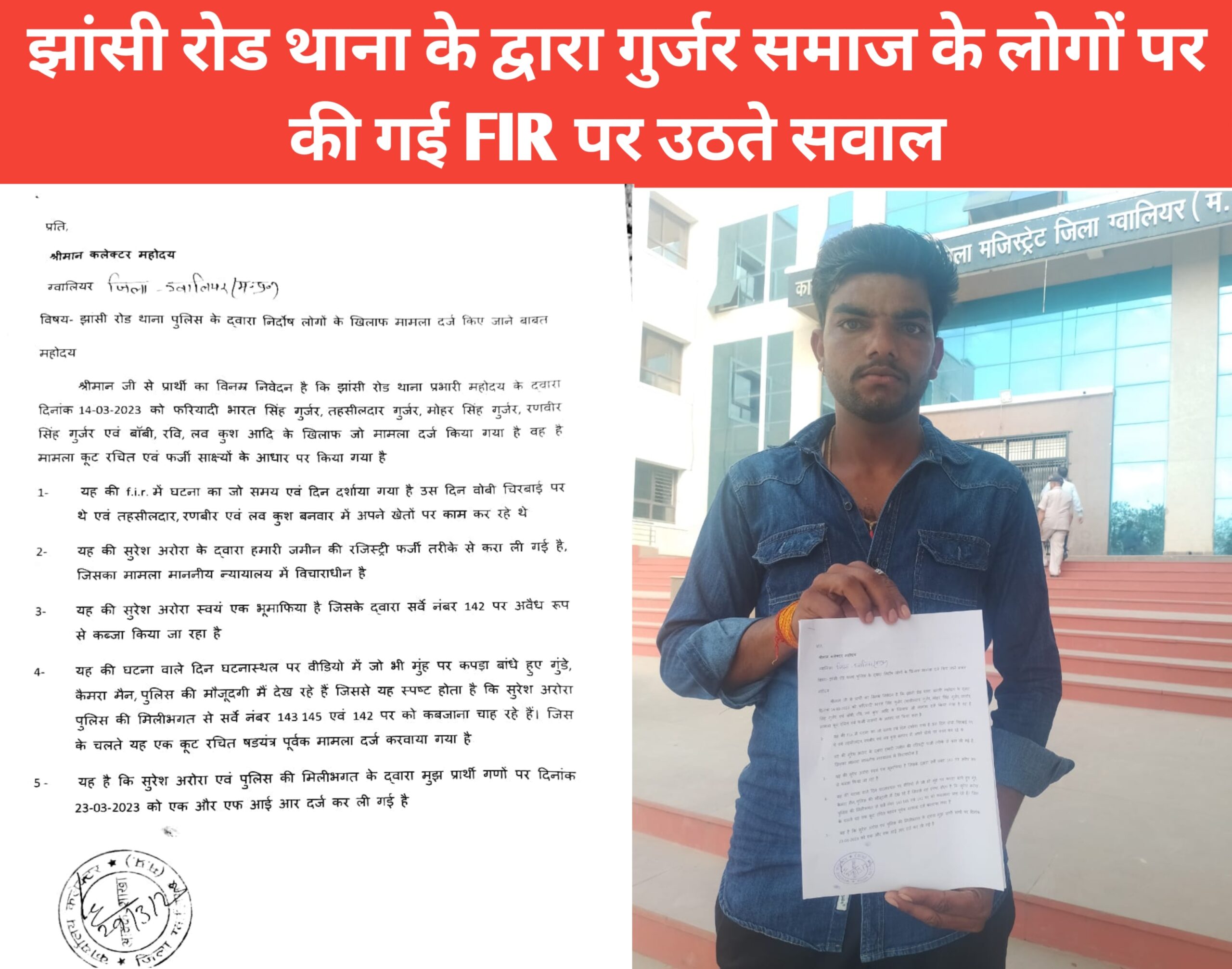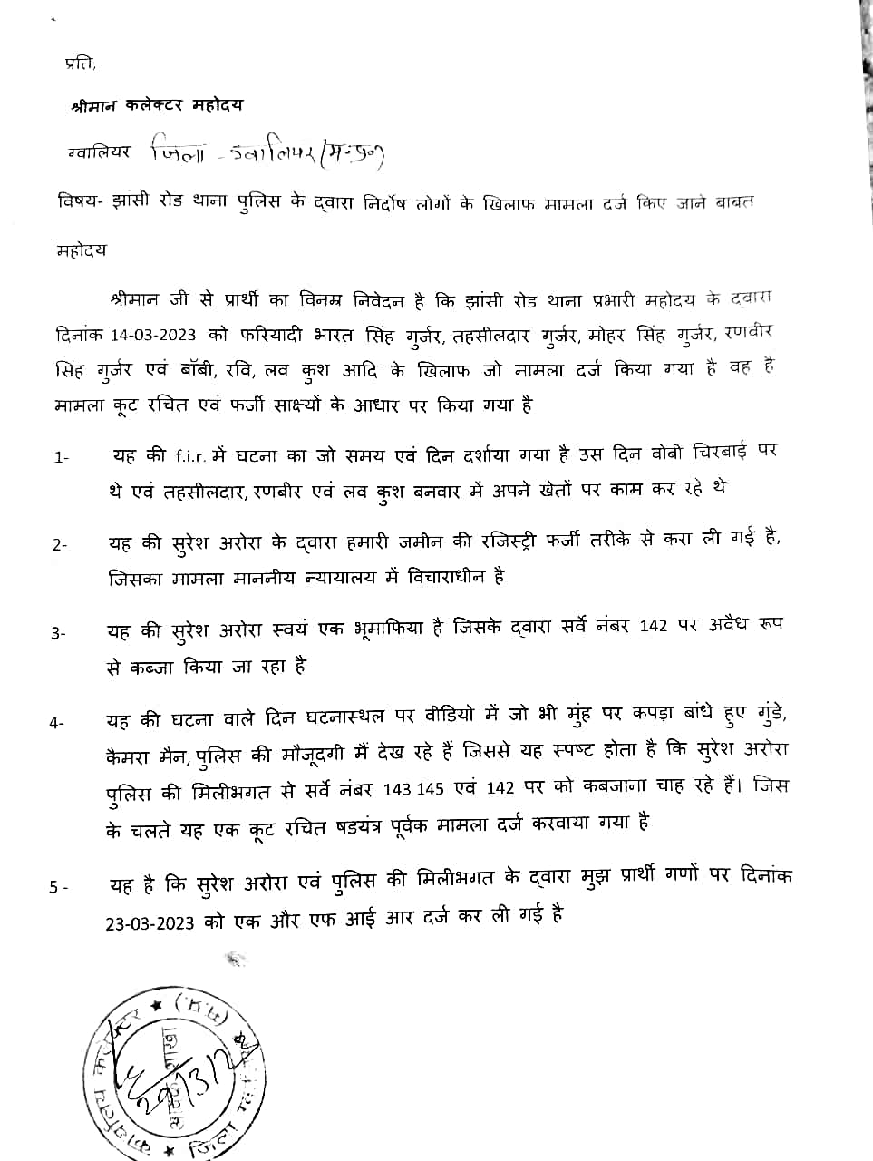 उन लोगों के द्वारा आज कलेक्टर महोदय ग्वालियर को दिए गए आवेदन मैं बताया गया है कि झांसी रोड थाना प्रभारी महोदय के द्वारा दिनांक 14/03/23 को भारत सिंह गुर्जर, तहसीलदार गुर्जर, मोहर सिंह गुर्जर, रणवीर सिंह गुर्जर एवं बॉबी, रवि, लव कुश आदि के खिलाफ जो मामला दर्ज किया गया है वह है मामला कूट रचित एवं फर्जी साक्ष्यों के आधार पर किया गया है। FIR में घटना का जो समय एवं दिन दर्शाया गया है उस दिन वोबी चिरवाई पर थे एवं तहसीलदार, रणबीर एवं लव कुश बनवार में अपने खेतों पर काम कर रहे थे। सुरेश अरोरा के द्वारा हमारी जमीन की रजिस्ट्री फर्जी तरीके से करा ली गई है, जिसका मामला माननीय न्यायालय में विचाराधीन है।