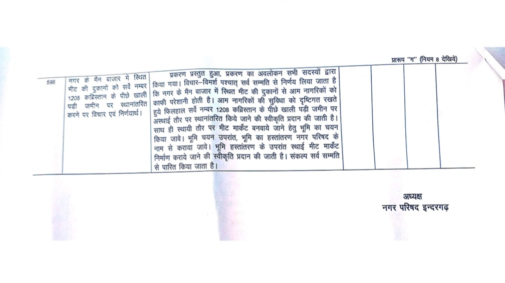 आपको बता दें कि पूर्व नगर सरकार के द्वारा पारित किया गया ठहरा प्रस्ताव क्रमांक 598 मै स्पष्ट रूप से उल्लेख किया गया है कि आम नागरिकों की सुविधा को दृष्टिगत रखते हुये फिलहाल मीट मंडी को सर्वे नम्बर 1208 कब्रिस्तान के पीछे खाली पड़ी जमीन पर अस्थाई तौर पर स्थानांतरित किये जाने की स्वीकृति प्रदान की जाती है।