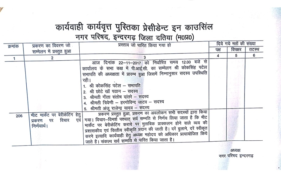 एवं प्रस्ताव क्रमांक 206 मै उल्लेख किया गया है कि मीट मार्केट पर बेरीकेटिंग कराये पर होने वाले व्यय की प्रशासकीय एवं वित्तीय स्वीकृति प्रदान की जाती है। लेकिन सीएमओ महेंद्र सिंह यादव के द्वारा “कुछ लोगों” के कहने पर उक्त विकास कार्यों को रोक दिया गया है