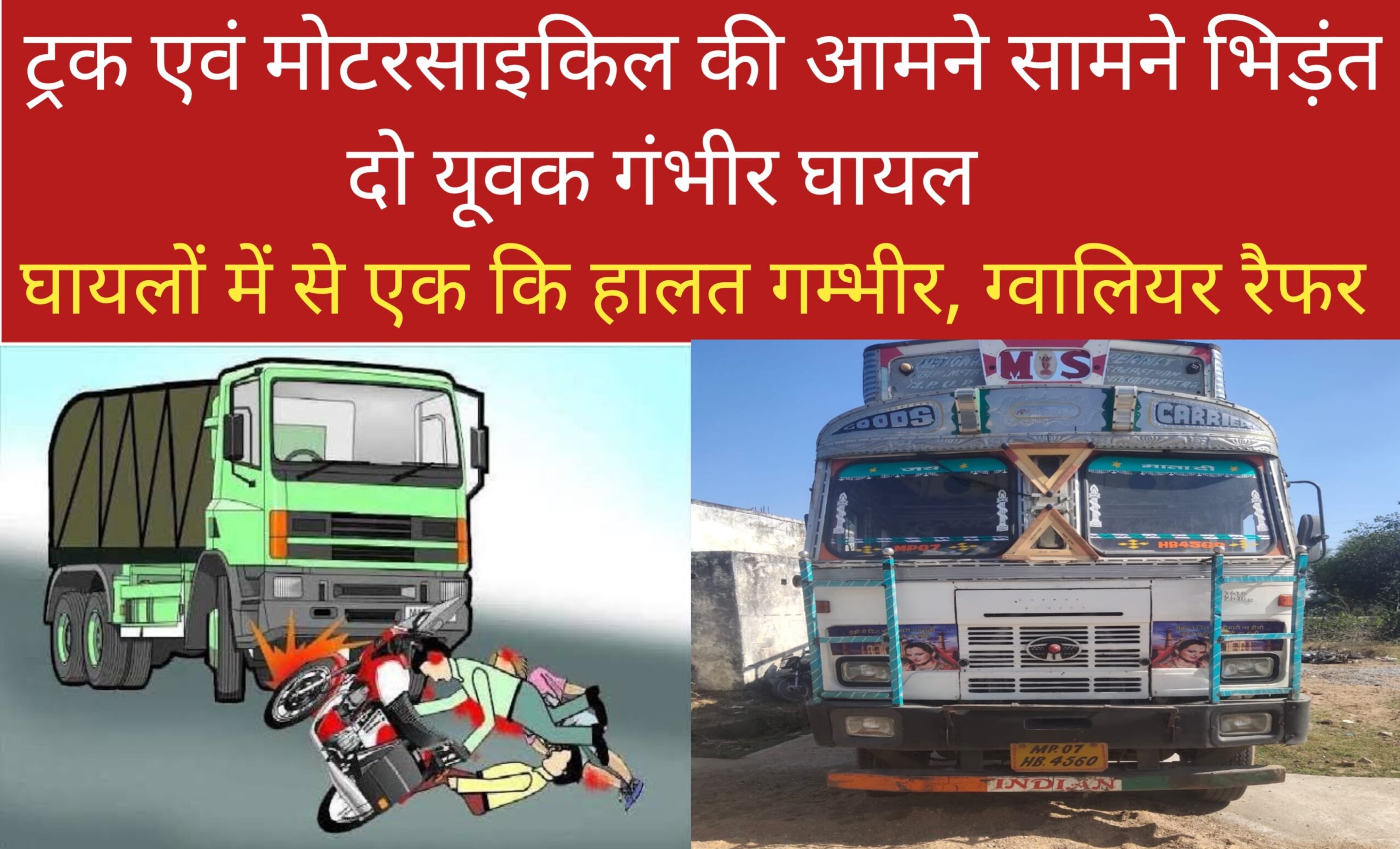 जानकारी के अनुसार राघवेंद्र पुत्र रामअवतार बघेल उम्र 20 बर्ष निबासी ग्राम बरहा ने जानकारी देते हुए बताया कि वह ओर उसके परिवार के ही संजेश पुत्र रामप्रकाश बघेल उम्र 22 बर्ष जो मोटरसाइकिल चला रहे थे, नोकरी के लिए फॉर्म भरने के लिए अपने गाओं बरहा से लहार आ रहा था तभी ग्राम मोहनपुरा के सामने रोड पर एक ट्रक क्र. MP07HB4560 ने तेजी व लापरवाही से चलाते हुए टक्कर मार दी जिससे ट्रक का पहिया संजेश के पैर के ऊपर से निकल गया। दोनों घायलों को 100 डायल सेवा की मदद से सिविल अस्पताल लहार लाया गया जहां से संजेश को प्राथमिक उपचार कर ग्वालियर रैफर कर दिया गया एवं राघवेंद्र का सिविल अस्पताल लहार में उपचार किया गया। ट्रक चालक मौके से ट्रक छोड़कर फरार हो गया जिसे पुलिस अभिरक्षा में थाना लहार में सुरक्षार्थ रखबाया गया